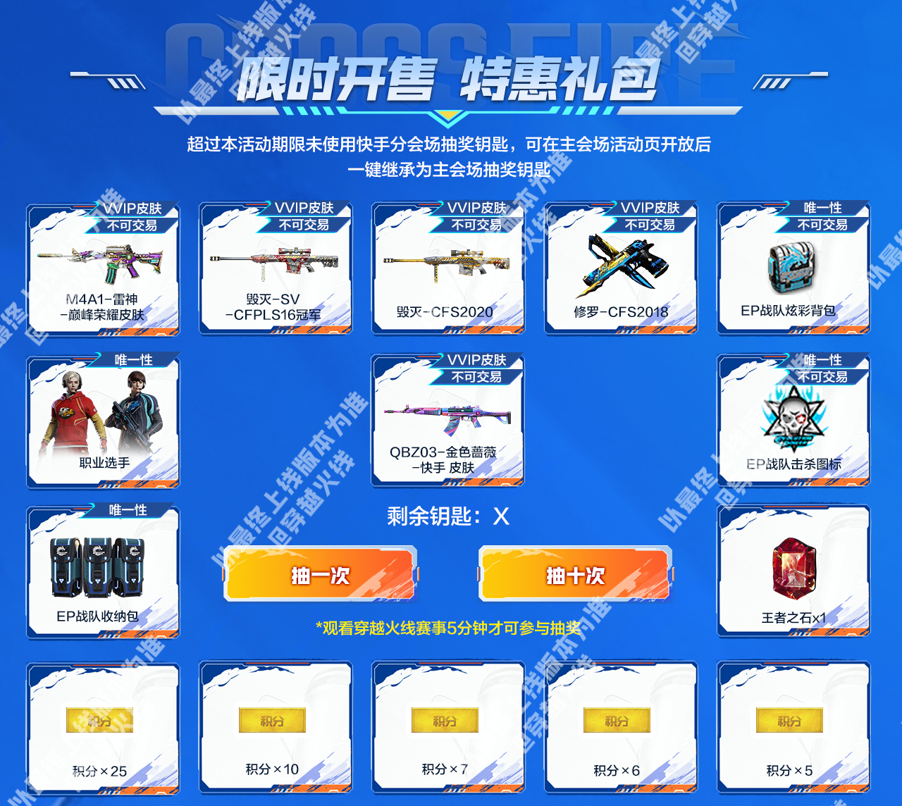 活动期间将限时发售特惠礼包,CFer们在活动页面购买CF福星和CF福宝将获赠指定数额的抽奖钥匙,抽奖钥匙可用于下方快手分会场主奖池的抽奖。