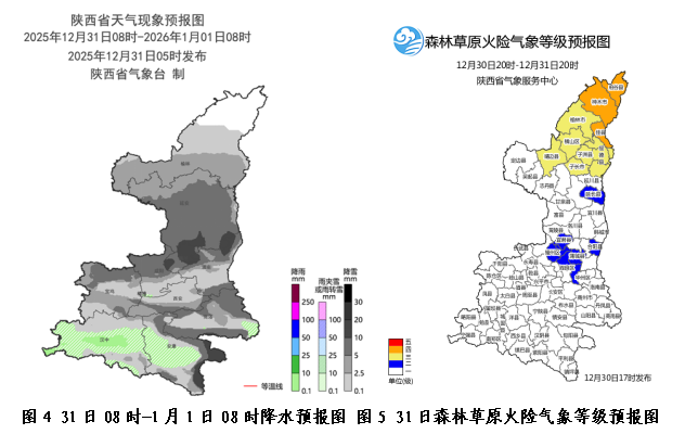 预计今天白天:全省阴天,榆林中南部有小到中雪(0.1-3毫米);延安、西安南部山区、宝鸡、咸阳中北部、铜川、渭南南部山区、汉中高海拔山区、安康高海拔山区、商洛有大雪(3-6毫米),其中延安南部(黄龙县、宜川县、洛川县、富县、甘泉县)、宝鸡东部局地(岐山县、凤翔县、麟游县)、咸阳北部(礼泉县、乾县、永寿县、彬州市、淳化县、旬邑县、长武县)、铜川全域、西安东南部山区(长安区、鄠邑区、蓝田县)、渭南南部山区(华阴市、华州区、潼关县)、商洛大部(商州区、洛南县、山阳县、镇安县、柞水县)有暴雪(6-10毫米),延安南部局地(黄陵县、黄龙县、宜川、洛川县)、铜川北部局地(印台区、耀州区、宜君县)、渭南北部局地(韩城市、合阳县、白水县)、咸阳北部局地(永寿县)、巴山局地(紫阳县、平利县、镇坪县、旬阳市、白河县、山阳县)有大暴雪(10-14毫米);关中平原雨夹雪转中到雪(2-6毫米),陕南河谷地区有小到中雨(3-10毫米)转雨夹雪;巴山雨夹雪转中到大雪(2-6毫米),安康部分地方(宁陕县、紫阳县、平利县、镇坪县、旬阳市、白河县)暴雪(6-10毫米)。雨雪期间,能见度较低。关中东部、陕南南部有4级左右(5.5-7.9米/秒)偏东风,阵风6-7级(10.8-17.1米/秒)。今天晚上:陕南西部、陕北西部阴天间多云,关中、陕南东部有分散性小雪或雨夹雪(0.1-1毫米)转阴天,陕北东部有小到中雪(0.1-2毫米)(图4)。日平均气温陕北北部下降2~4℃,关中西部、陕南大部下降4~6℃,陕北南部、关中北部和东部下降6~8℃,局地10℃以上。清晨陕北南部、关中、陕南有雾。今日榆林大部森林草原火险气象等级为3-4级(较高-高度危险)(图5),需注意防范。