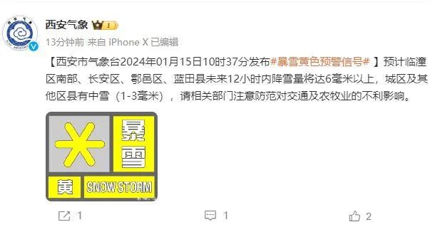 预计临潼区南部、长安区、鄠邑区、蓝田县未来12小时内降雪量将达6毫米以上,城区及其他区县有中雪(1-3毫米),请相关部门注意防范对交通及农牧业的不利影响。