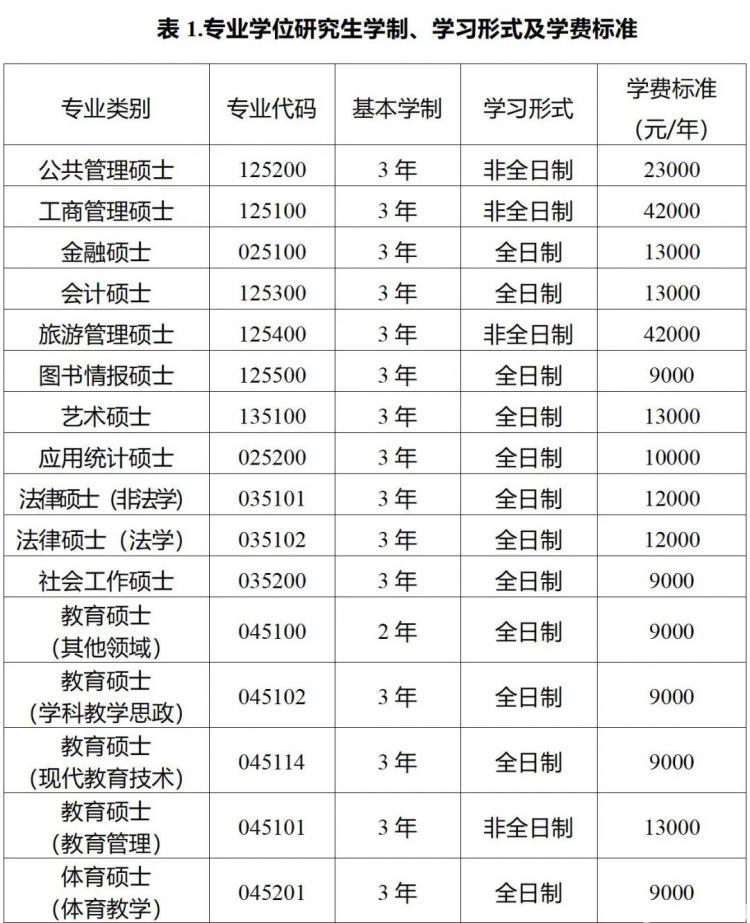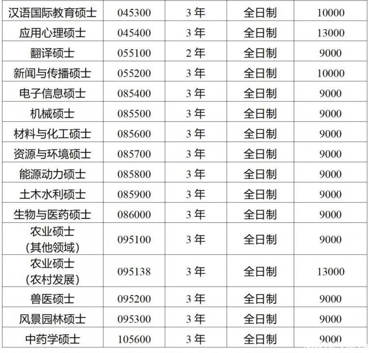 注:艺术硕士、教育硕士等含有多个领域的类别(专业代码前四位相同),同类别其他领域(均按类别代码+00说明)的学制、学习形式、学费相同(特别标明的专业领域除外)。