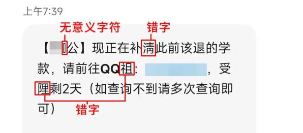 诈骗分子需要用错误标点符号、错别字、多字等,来规避安全系统对敏感词的筛查,所以才会出现以下带有各种错别字、无意义字符的短信。