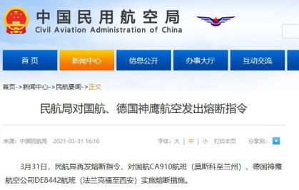 3月31日,民航局再发熔断指令,对国航CA910航班(莫斯科至兰州)、德国神鹰航空公司DE8442航班(法兰克福至西安)实施熔断措施。