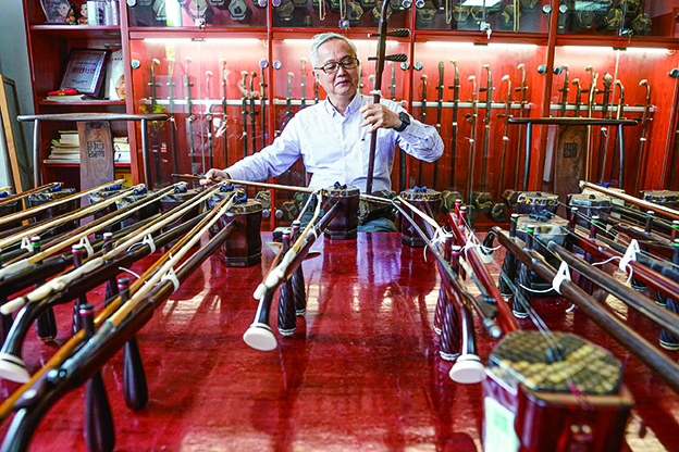 ▲香港乐器经销商在无锡梅村街道二胡产业园古月琴坊车间内试琴(2023年3月28日摄)。本报记者季春鹏摄