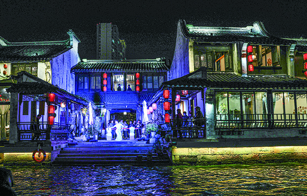 昔日工业遗产,化作条条“水弄堂”。入夜,清名桥历史文化街区迎来一天中最动人的时刻。人们乘坐画舫穿梭在桨声灯影里,两岸的丝厂、茶楼、书场、戏台等古迹勾勒出迷人的水乡景致;岸上,前店后坊人头攒动,人们品尝着美食、香茗,陶醉于夜色下的江南风情。