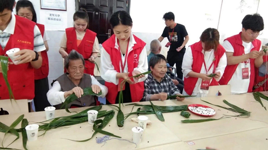 南京科技职业学院的志愿者们走进敬老院,陪老人过端午节。