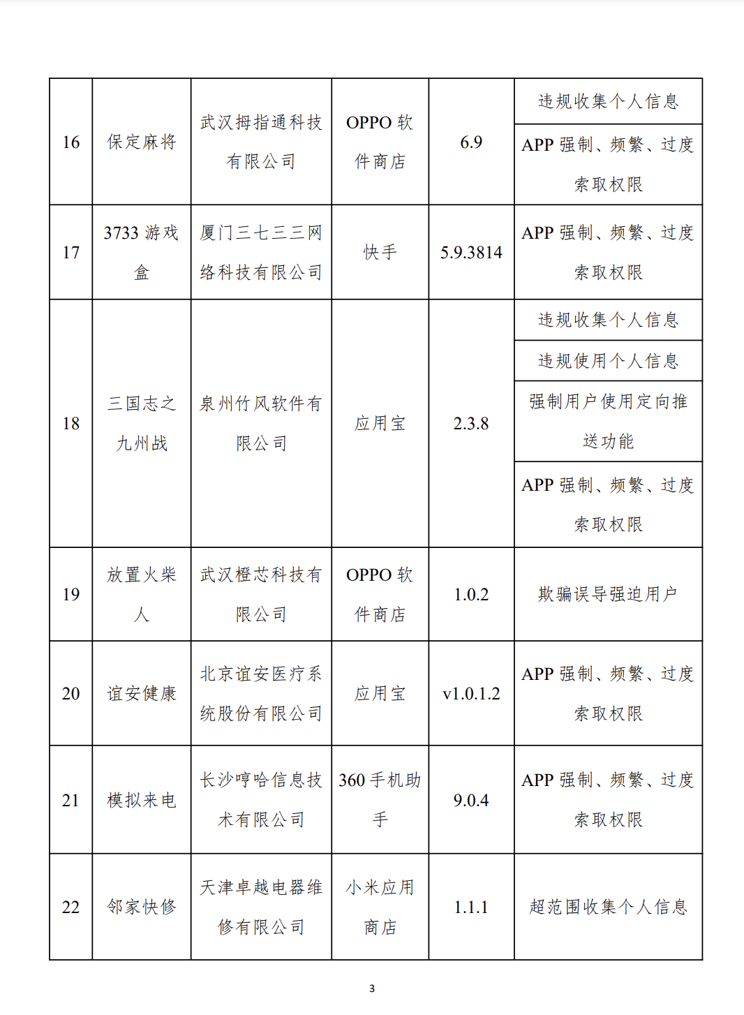 澎湃新闻注意到,有多款游戏产品出现在违规名单中,如汽车模拟器 2019、保定麻将、3733游戏盒等,涉及欺骗误导强迫用户等。其中,泉州竹风软件有限公司出品的“三国志之九州战”游戏APP涉及违规收集、使用个人信息、强制用户使用定向推送功能以及APP强制、频繁、过度索取权限。