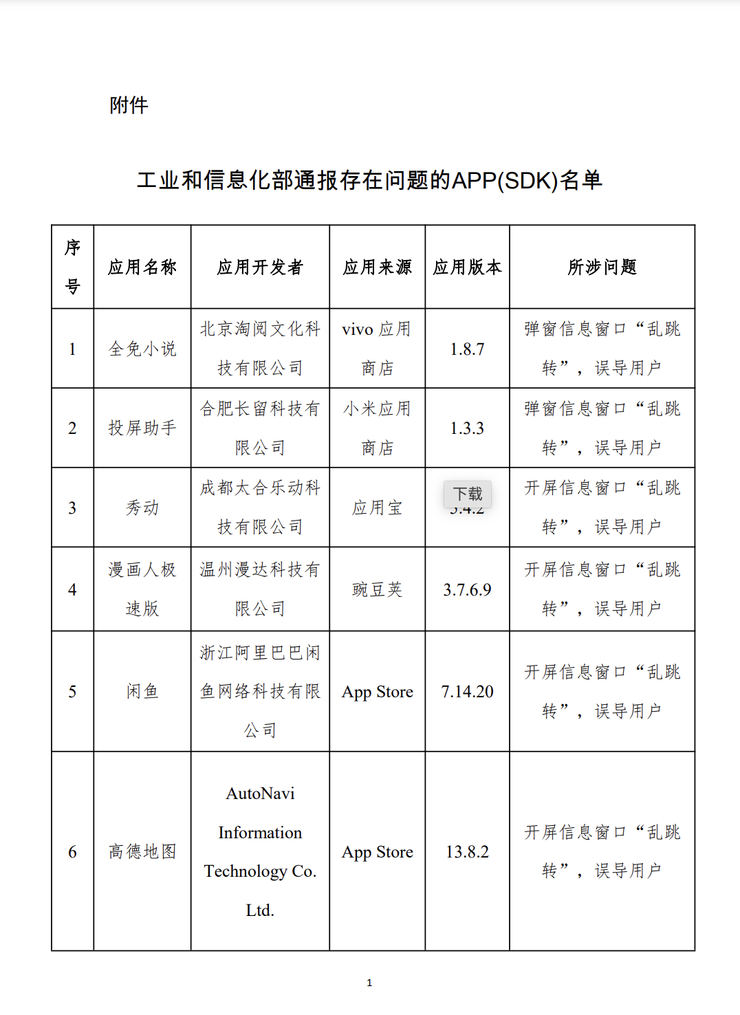 1月22日,工业和信息化部通报了31款APP及SDK存在侵害用户权益行为。其中,闲鱼、高德地图、下厨房等多款APP均被通报开屏弹窗“乱跳转”,多款游戏APP存在强制、频繁、过度索取权限等违规收集个人信息的行为。