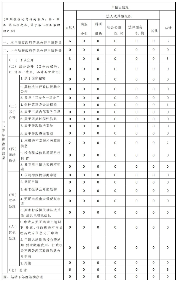2023年,共收到依申请公开6件,均严格按照《政府信息公开条例》有关规定进行办理答复,其中,予以公开3件,不予公开1件,本机关不掌握相关政府信息2件。未发生因政府信息公开申请行政复议、提起行政诉讼的情况。