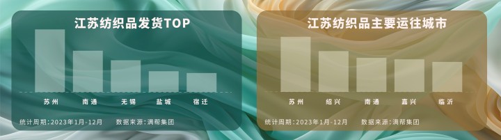 报告相关数据显示,苏州持续领跑江苏纺织品发货量和江苏纺织品收货城市榜单前五:发货吨量远超省内发货第二、三名南通、无锡,是省内发货第四、五位的三倍;而在江苏纺织品前往目的地榜单上,苏州也是跑赢绍兴、南通,几乎是嘉兴和临沂两地收货量之和。