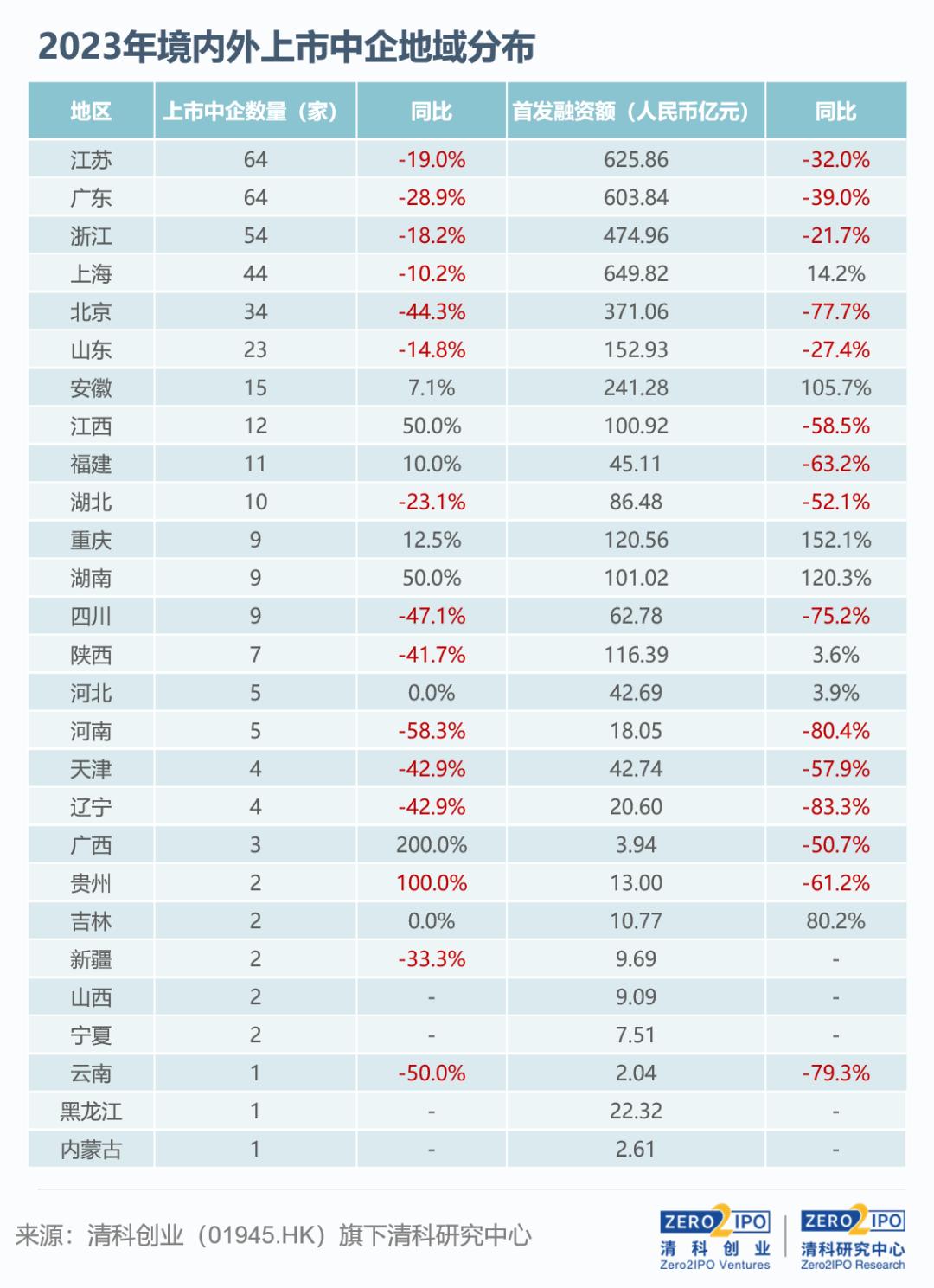 近日,清科研究中心发布2023年IPO年终盘点:过去一年中企境内外上市共399家,其中江苏和广东均有64家中企上市排名并列第一。