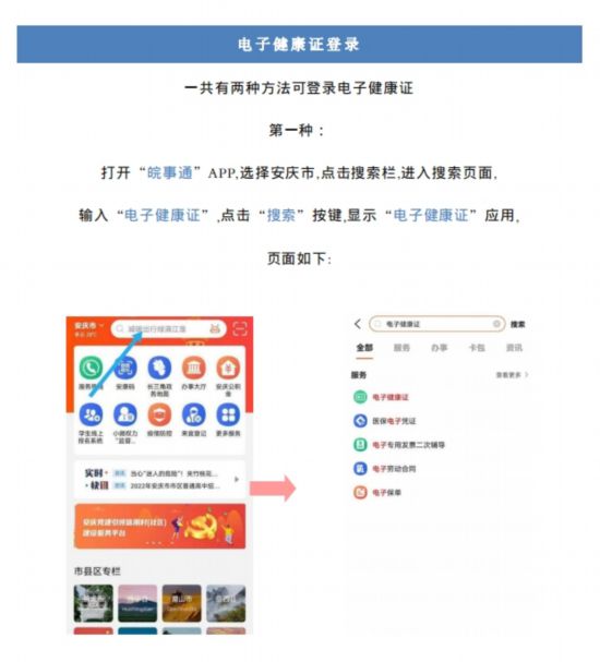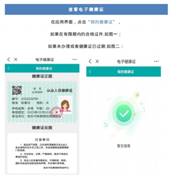 为进一步创优营商环境、回应民生关切,根据省卫健委、省市场监管局、省数据资源局和省药监局《关于全面推广“电子健康证”的通知》要求,经过需求调研和技术攻坚,目前安庆市已实现“食品药品(含医疗器械、化妆品)生产经营、公共场所和生活饮用水从业人员健康证”(简称 “电子健康证”)线上预约、信息采集、智能审核、线上领取、自助查询打印和移动端监管。经研究决定,自2024年1月1日起,在安庆市全面启用“电子健康证”。现将有关事项通告如下:
