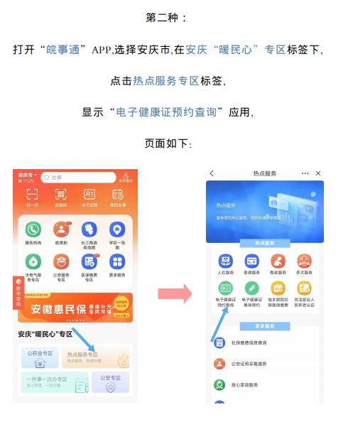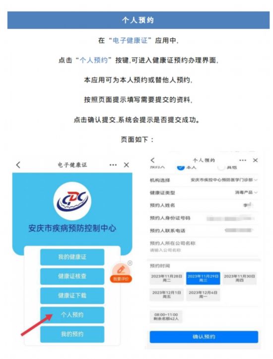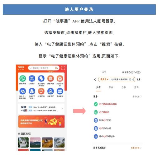 “皖事通”APP安庆分厅已上线“电子健康证”和“电子健康证集体预约”应用,分别支持个人和集体在线预约健康体检。