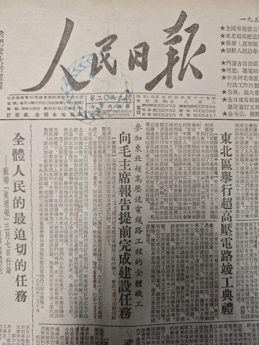 1953年7月15日,“506”工程正式开工,只经过半年的时间,就于1954年1月23日正式竣工。这就是我国第一条220千伏输电线路——松东李线。线路长达369公里,架设919基输电铁塔,堪称电力建设史上的一次壮举。