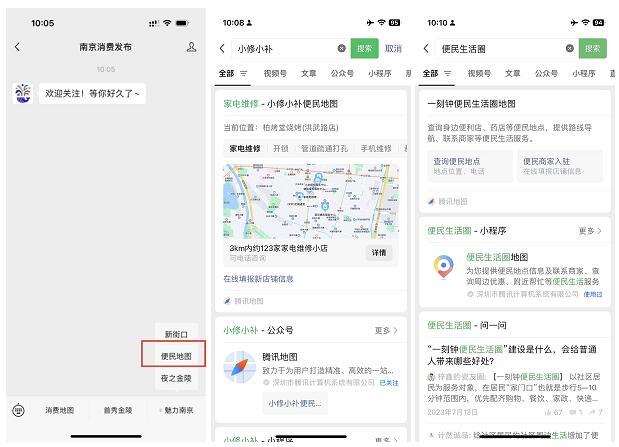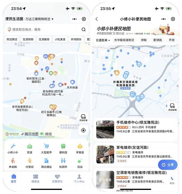 2023年2月,腾讯发起小修小补引路行动,发布全国首张小修小补便民地图,11月,升级行动并发布全国首张一刻钟便民生活圈地图,并开始推进便民地图的城市试点共建。以此次南京市便民生活圈地图发布为起点,微信和腾讯地图未来将联合更多市民、小店以及合作方共同参与到城市便民生活圈地图的共建中,也将为小店提供更多数字化权益,并从南京试点拓展至全国其他城市,一同修补我们的附近,共建我们的“方圆800米”。