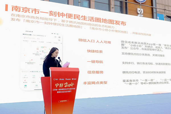 2024年1月20日,在江苏省一刻钟便民生活节启动仪式上,由南京市商务局指导,腾讯地图和微信联合推出的「南京市一刻钟便民生活圈地图」、「南京市小修小补便民地图」正式面向南京市民、商户上线,腾讯将以南京市作为“一刻钟便民生活圈地图”的首个核心试点城市,推动便民地图城市共建,助力打造便民地图城市标杆。