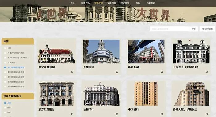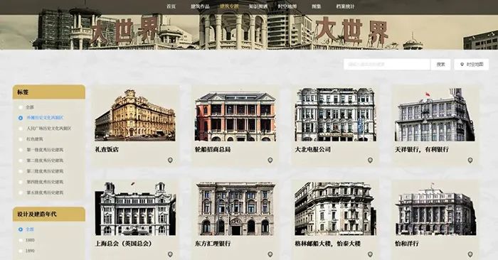 系统从时间和空间两个维度,结合建筑师、机构、建筑用途等可定制的标签,在地理信息平台上对历史建筑进行筛选、展示,并与知识库、原始档案相关联,追溯展现上海城市发展历程。