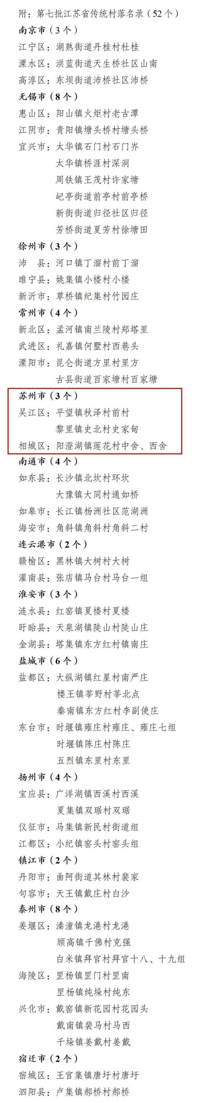 近日,第七批江苏省传统村落名单公布,全省共52个村落入选,其中苏州入选3个,分别为吴江区平望镇秋泽村前村;吴江区黎里镇史北村史家甸;相城区阳澄湖镇莲花村中舍、西舍。