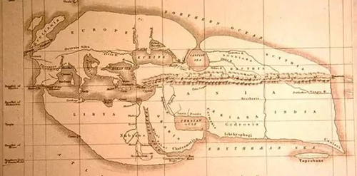 公元前276年—公元前194年,古希腊地理学家埃拉托色尼绘制的世界地图。埃拉托色尼被西方地理学家推崇为“地理学之父”,除了他在测地学和地理学方面的杰出贡献外,他还是第一个创用了“地理学”这个词汇的人。
