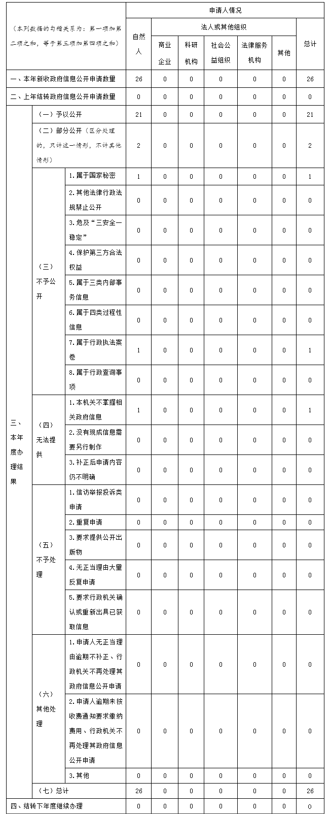 (二)依申请公开情况。健全完善政府信息依申请公开制度,指导全县各单位规范依申请公开答复程序和内容,依法依规答复释疑,办理答复更加规范、高效、便民。全县各级累计受理依申请公开信件26件,按期规范答复26件,办结率100%,全力保障了公众申请信息需求。