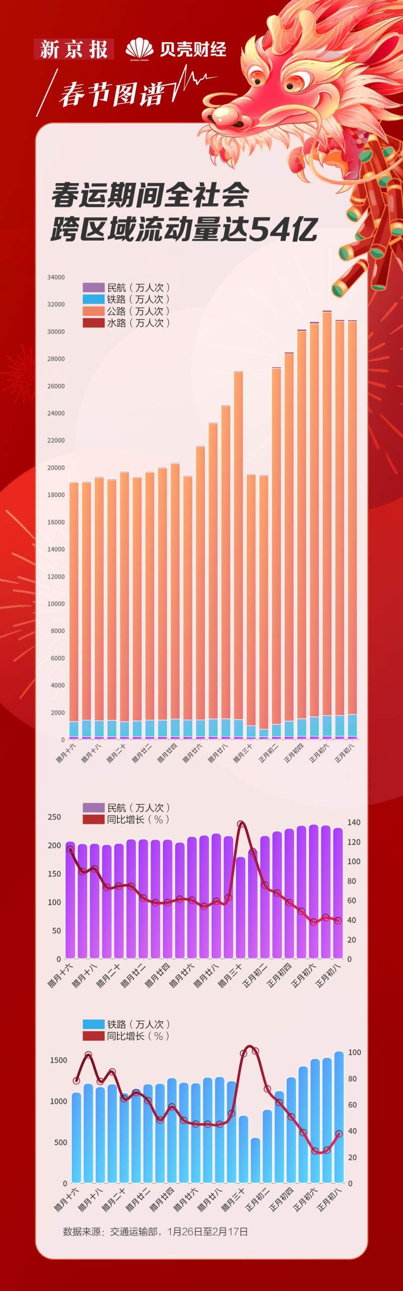 2024年,春节假期迎来“8+1”超长模式,很多人选择了前期探亲、后期旅游的过节方式。春节前,交通运输部预期春运40天内将有90亿人次流动,其中72亿人次属于自驾出行。截至2月17日,春运期间全社会跨区域流动总计已达到54.02亿人次(据交通运输部,1月26日为春运第一天)。这个春节,你是在路上迁徙,还是居家休息?新京报贝壳财经带你一览2024年春节迁徙地图。