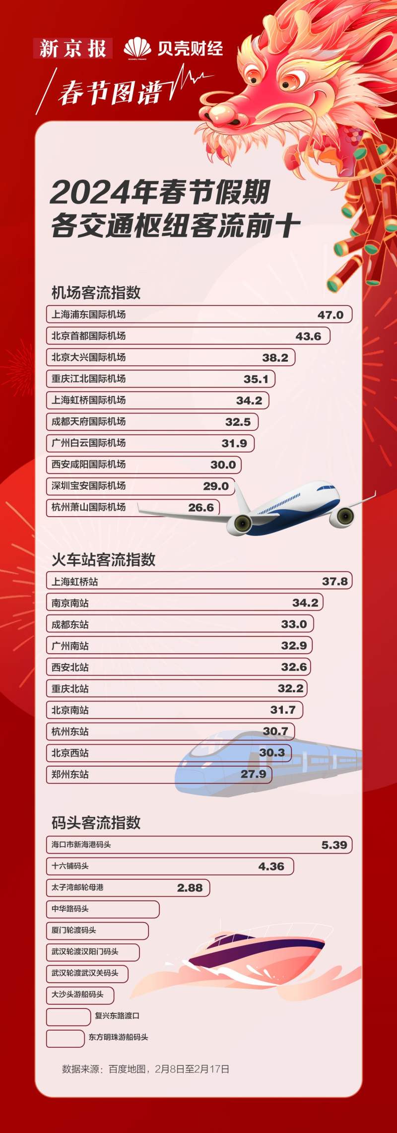 各大交通枢纽均为春运及假期期间旅游保驾护航。根据百度地图中国重点客运交通枢纽拥堵监测数据,2024年春节期间,全国客流指数最高的机场前三位分别是上海浦东国际机场、北京首都国际机场和北京大兴国际机场;全国客流指数最高的火车站前三位分别是上海虹桥站、南京南站和成都东站。
