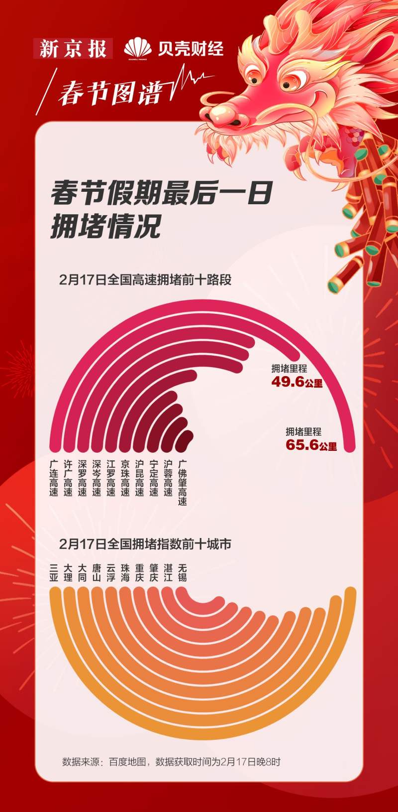 春节假期最后一日,“拥堵”也是不变的主题。根据百度地图的数据,2月17日晚全国高速拥堵前十路段均在南方地区,广东较为集中,京珠高速、沪昆高速、宁定高速、沪蓉高速位列榜单之上。
