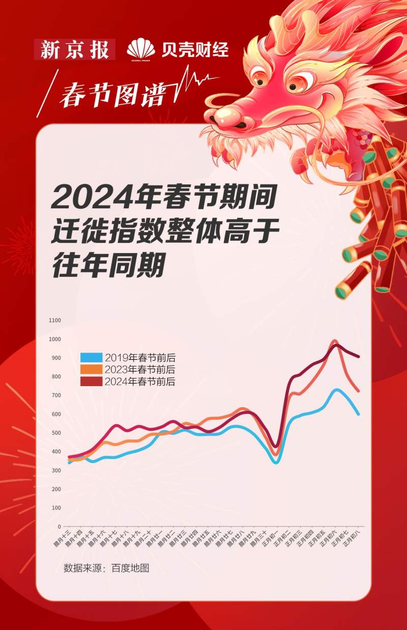 根据百度迁徙的数据,2024年春节期间的全国人口迁徙指数整体高于往年同期,正月初六迎来迁徙最高峰。