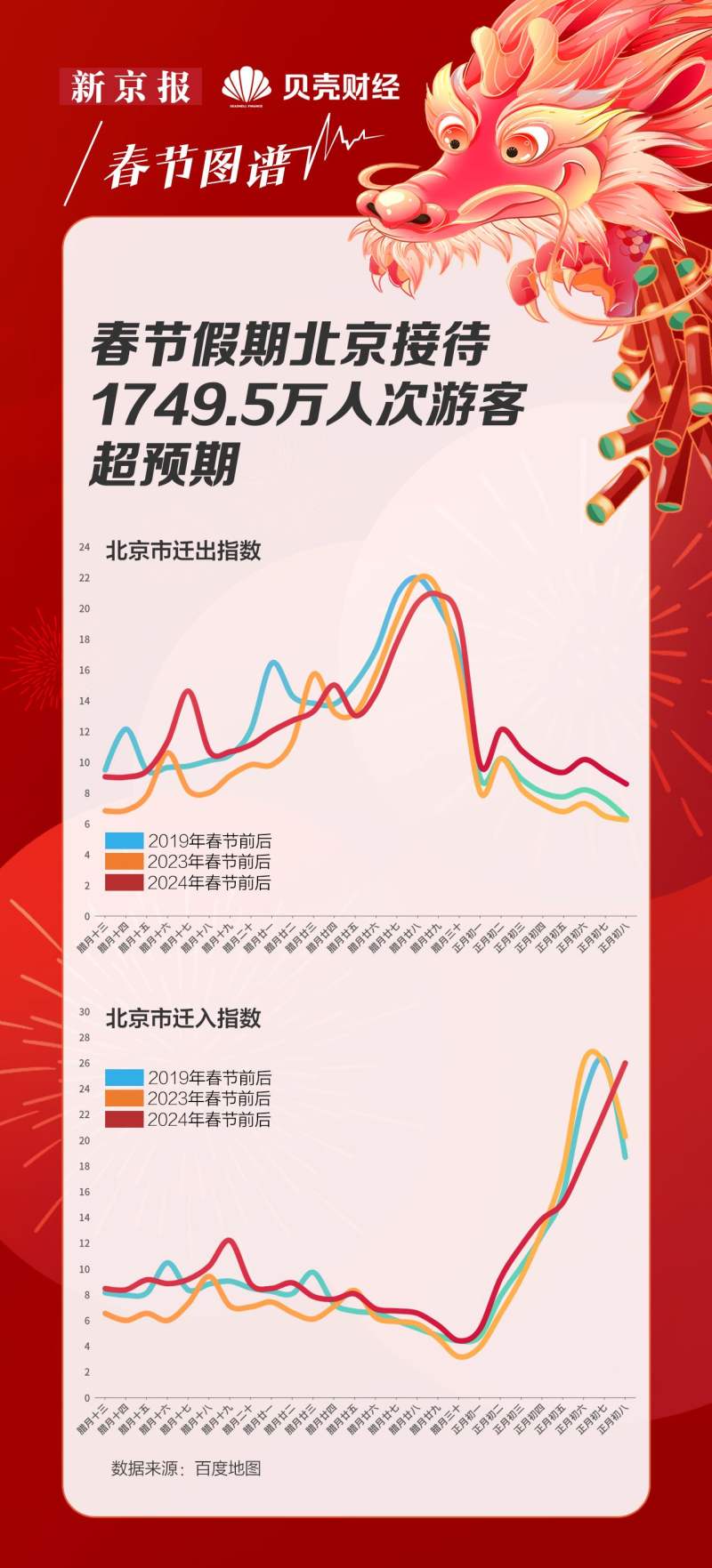 根据百度迁徙大数据平台的数据,春节期间,北京市的迁入迁出指数呈现明显的周期性起伏。腊月二十九(2月8日),2024年北京迁出指数达到峰值,而在此前的腊月十七(1月27日)、腊月二十四(2月3日),迁出指数迎来小高峰,两天均为节前的周六,推测为提前请假返乡或出行的人群——总有一些令人羡慕的上班族,假期更长。