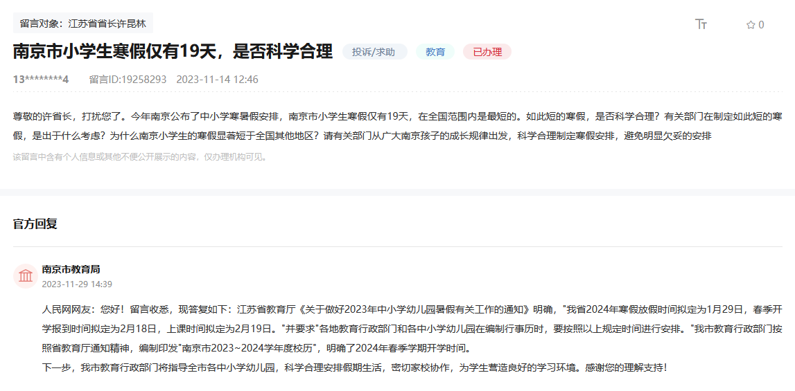 11月14日,网民在人民网“领导留言板”给江苏省省长许昆林留言称,今年南京公布了中小学寒暑假安排,南京市小学生寒假仅有19天,在全国范围内是最短的,“如此短的寒假,是否科学合理?有关部门在制定如此短的寒假,是出于什么考虑?为什么南京小学生的寒假显著短于全国其他地区?请有关部门从广大南京孩子的成长规律出发,科学合理制定寒假安排,避免明显欠妥的安排。”
