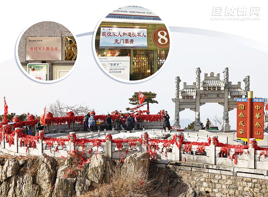 2月10日0时至2月16日14时,山东省泰安市泰山景区累计接待进山游客35万余人次,同比增长21.06%。左上小图为泰山景区内的退役军人服务站标牌和景区售票处的优待标识。朱峥、潘勇摄