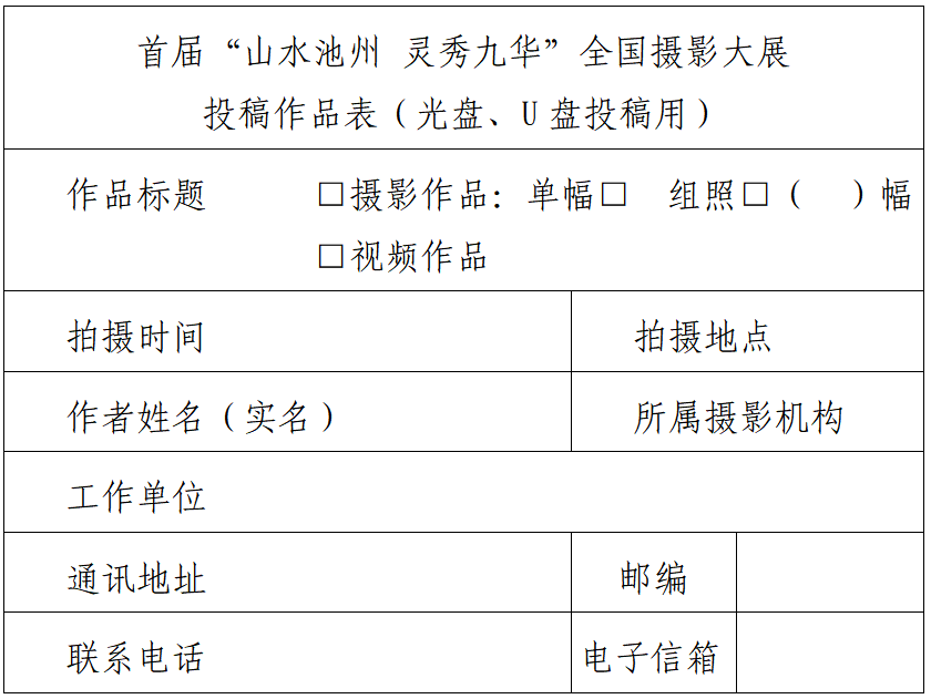 投稿作品以光盘(CD-R或DVD-R)、U盘存储形式邮寄至:北京市东城区东四十二条48号中国摄影报社活动部首届“山水池州 灵秀九华”全国摄影大展办公室收(100007)