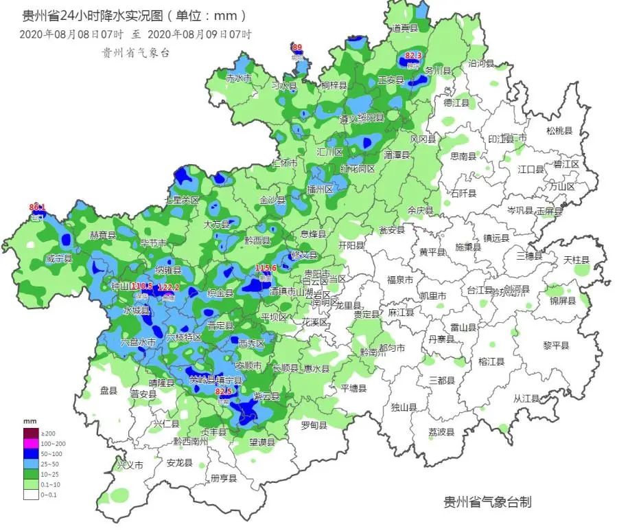 其中,大暴雨出现在纳雍、清镇、水城3县域内的3个观测站(最大为纳雍鱼塘122.5毫米),暴雨出现在27县域内的122个观测站,大雨有288个观测站,大雨以上降水主要分布在遵义市中西部、毕节市、六盘水市中北部、安顺市和贵阳市西部。