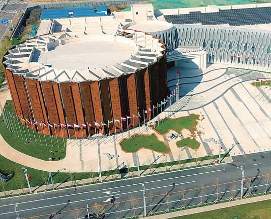 会议中心南侧广场,从空中俯瞰,整体图案展现为世界地图六大洲图样(不含南极洲),锈色金属边框包裹绿色草坪,极简的工业风更加具体地展示出场馆的国际化定位。