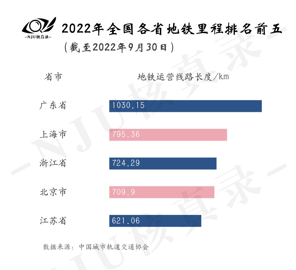截至2022年9月30日,江苏省地铁运营里程621.06km,仅次于广东省、上海市、浙江省和北京市。