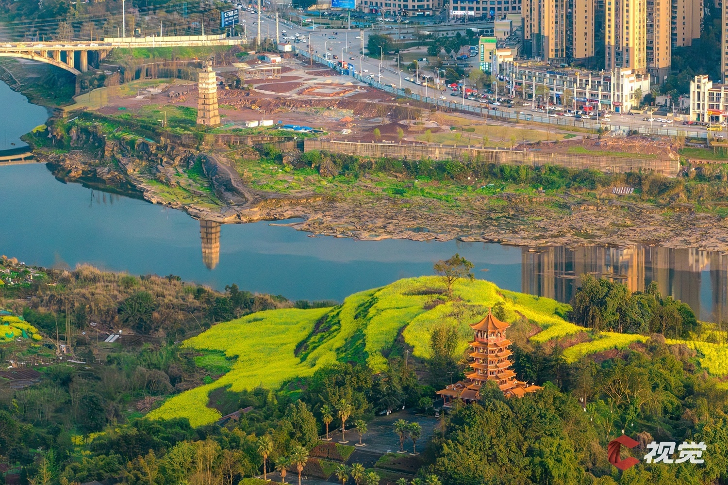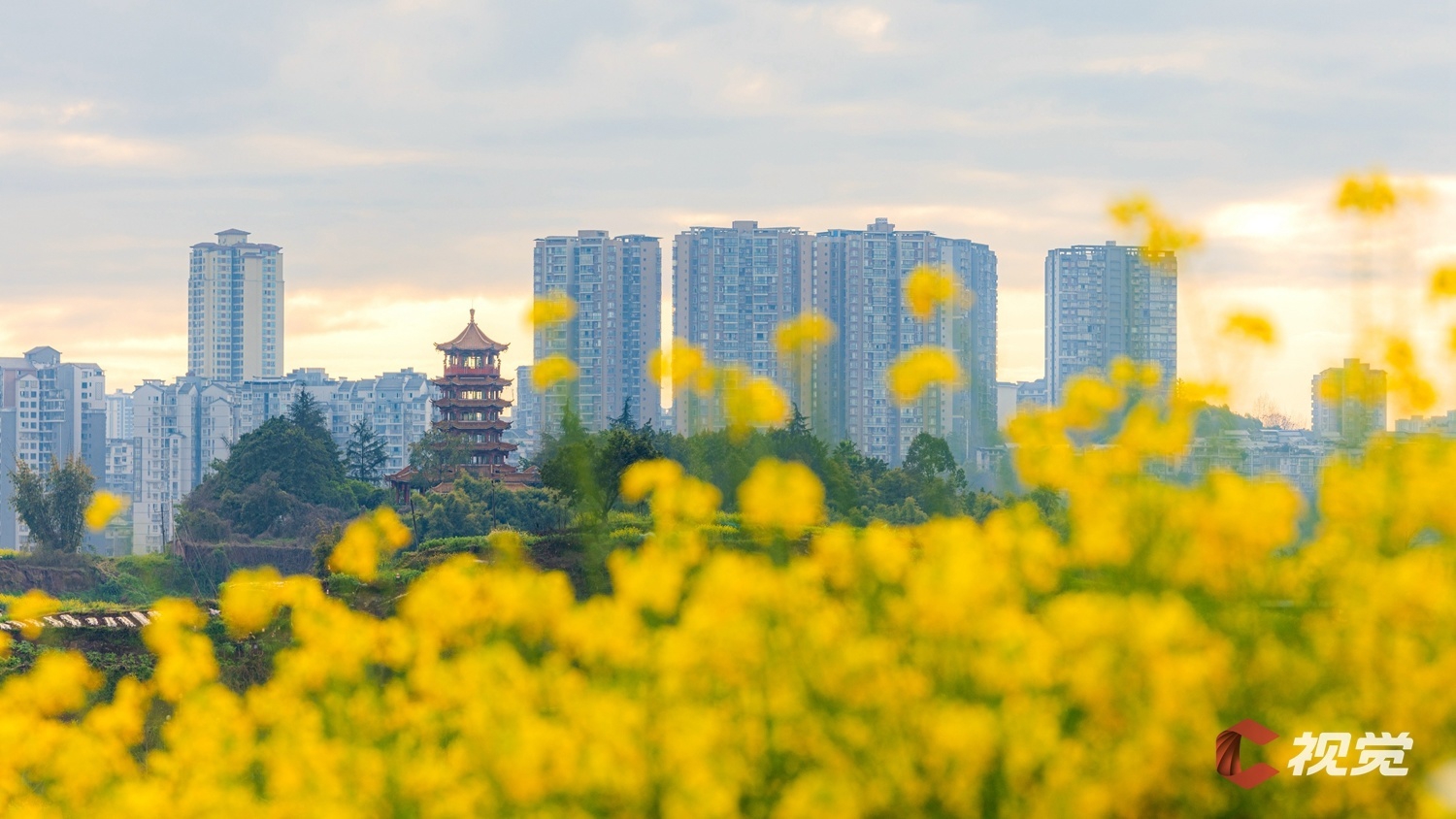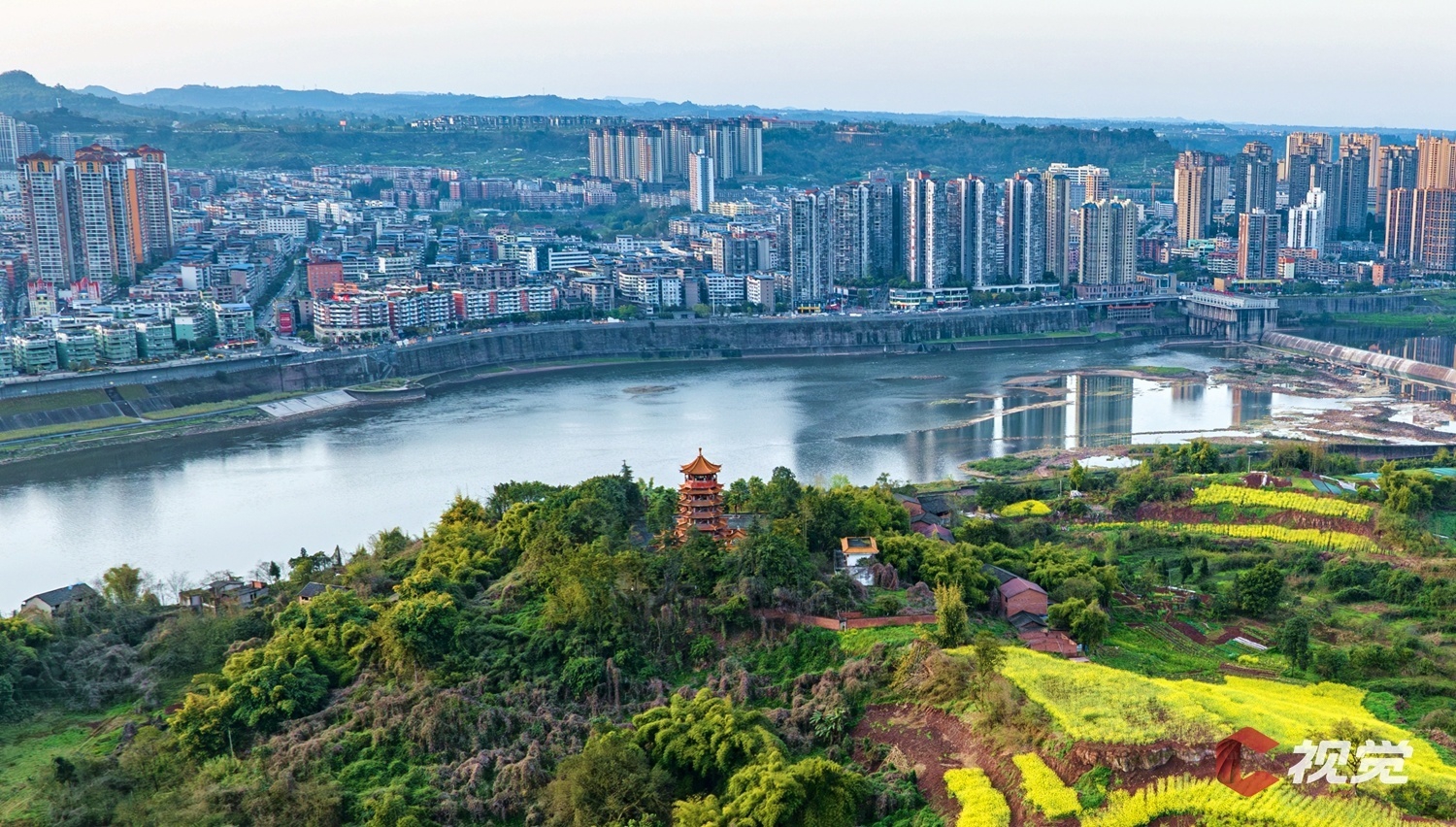 渠江边的油菜花盛开,与城市高楼交相辉映。
