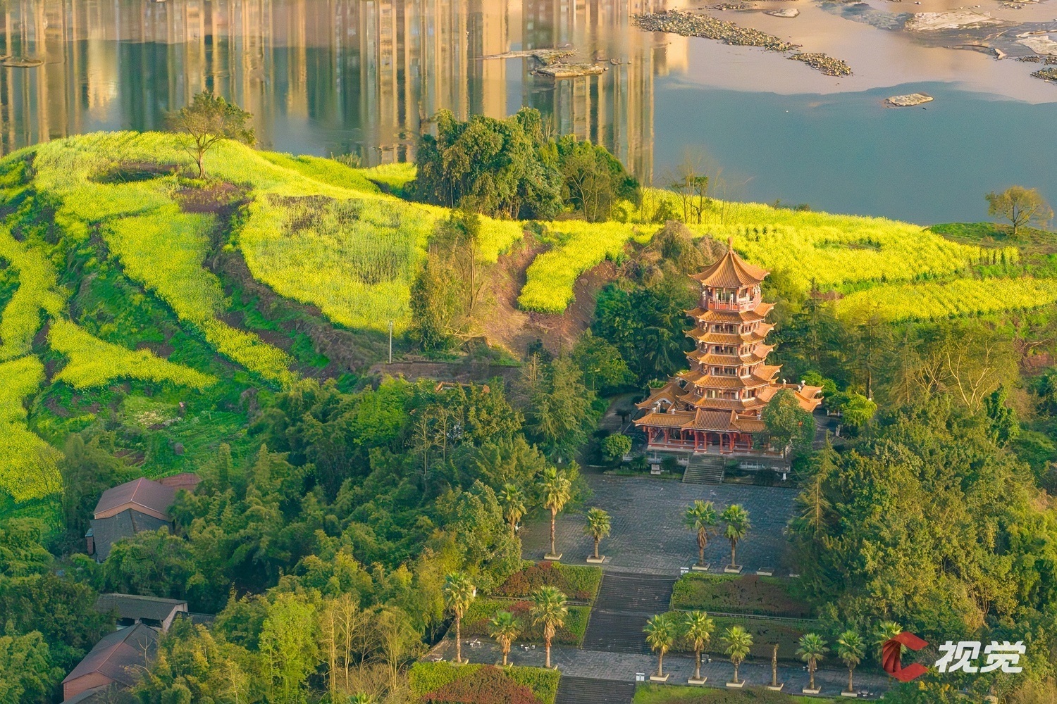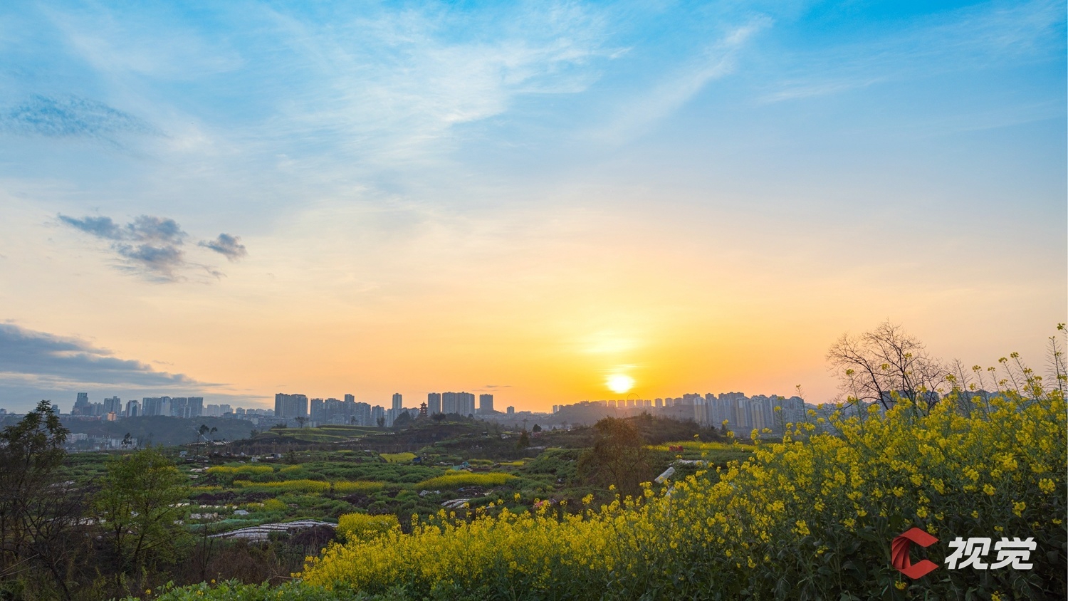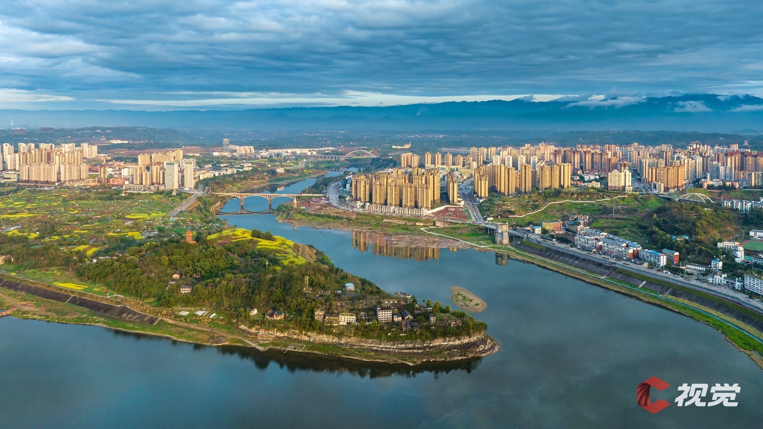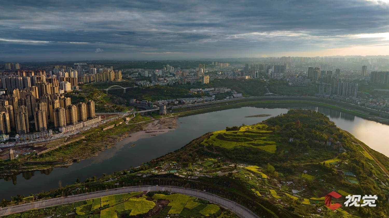 渠江边的油菜花盛开,与城市高楼交相辉映。