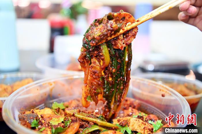 3月14日,甘肃省天水市秦州区,食客展示裹满红油辣子的麻辣烫。九美旦增 摄