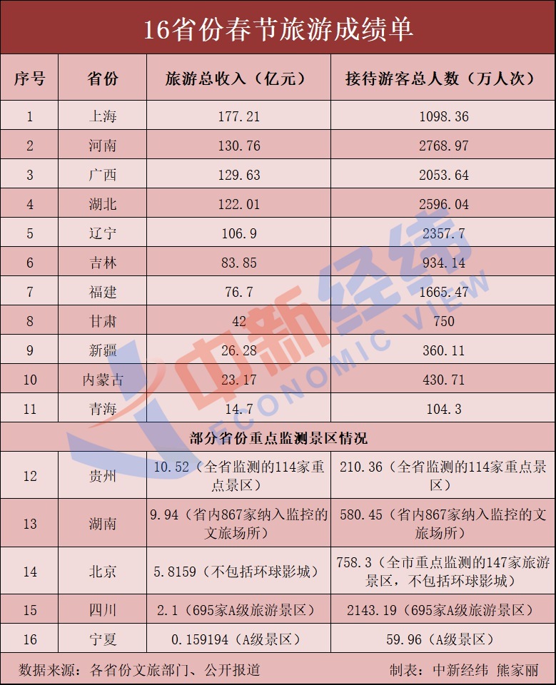 2022年春节假期结束,据中新经纬不完全统计,截至2月7日20时,已有上海、河南、广西、湖北、辽宁、四川、宁夏等16省份公布2022年春节假期旅游收入。