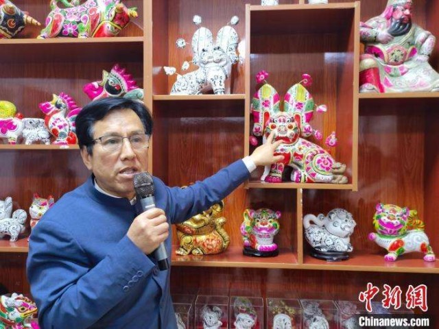 图为胡新明正在介绍凤翔泥塑。杨英琦 摄