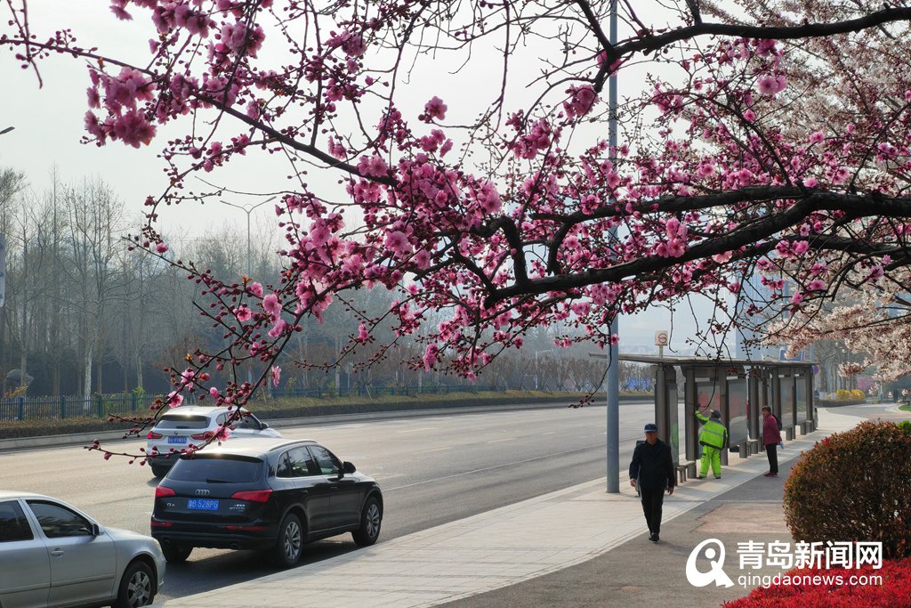白花清若雪,紫叶艳如霞。海安路上的紫叶李,远远望去,细细密密的粉白色小花在阳光下温柔的绽放,绘就了属于春天的浪漫气息。在川流不息的香港东路上,处处梅香浮动,沁人心脾,让人不仅沉醉在这“梅”好时光之中。