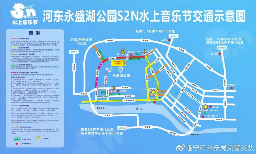 绕行建议:因举办“S2N水上音乐节”,期间车流量、人流量较大,特此设立了直达“水上音乐节”公交专线,请广大驾驶员将车辆停至河东新区市民中心以及环岛商务中心停车场内,在市民中心转乘公交直达“S2N水上音乐节”现场。