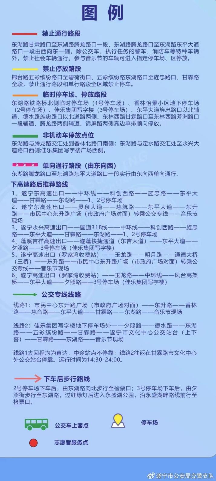 (5)遂宁高速出口(罗家湾收费站)——玉龙路——明月路——通德大桥——东升路——市民中心东升路广场转乘公交专线——音乐节现场;