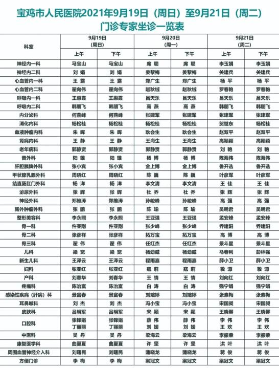 9月19日(星期日)至9月21日(星期二)医院门诊及健康体检中心正常开诊,医技相关检查全部开展,开诊时间为上午8:00-12:00,下午14:00-17:00。