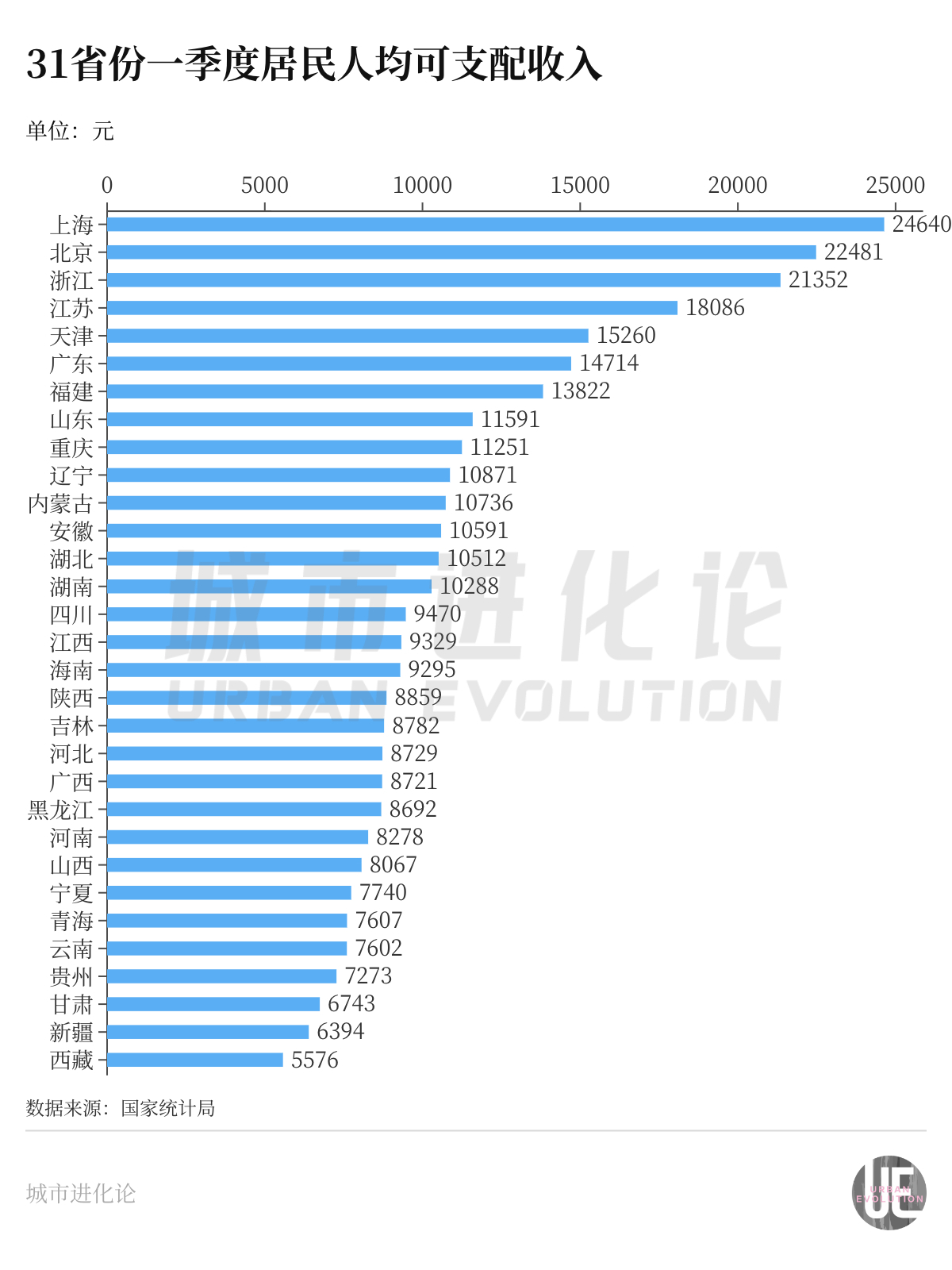 #放榜31省份一季度人均可支配收入:14省份过万,上海北京浙江超两万
