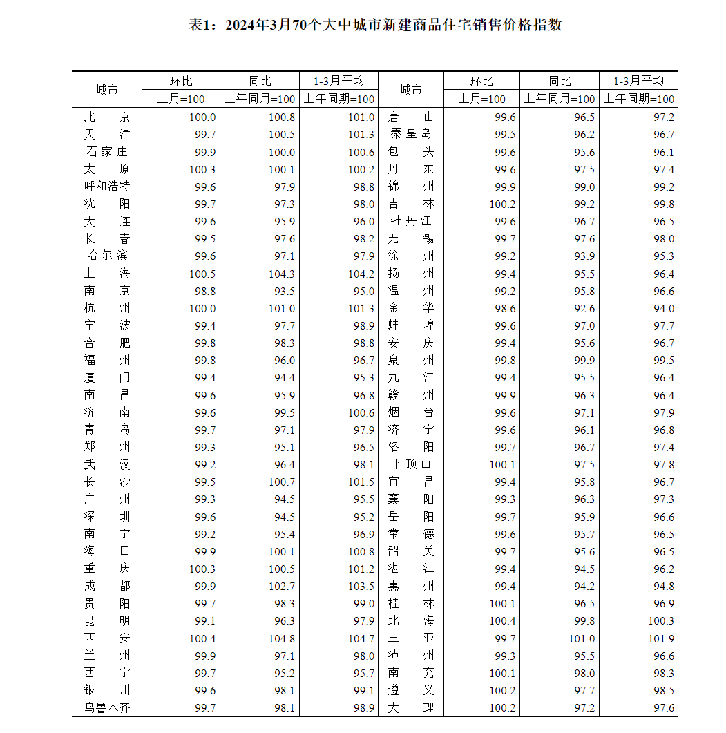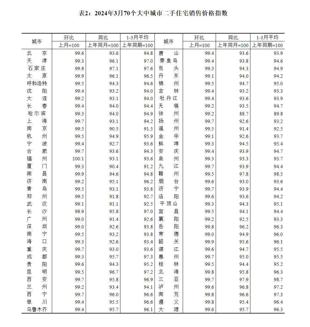 国家统计局城市司统计师王中华解读2024年3月份商品住宅销售价格变动情况统计数据称,2024年3月份,70个大中城市新建商品住宅和二手住宅成交量比前期有所上升,各线城市商品住宅销售价格环比降幅略有收窄、同比降幅扩大。