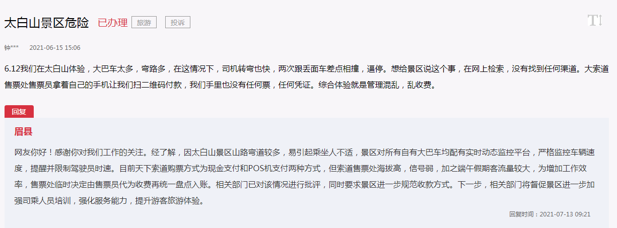 7月13日,宝鸡市眉县政府对这则留言进行了回复。回复中称,景区对所有自有大巴车均配有实时动态监控平台,提醒并限制驾驶员时速;后期,有关部门将督促景区加强司乘人员培训,强化服务能力,提升游客旅游体验。针对网友反映的乱收费现象,答复称:由于索道售票处海拔高,信号弱,加之端午假期客流量较大,为提高工作效率,售票处临时决定由售票员代为收费再统一盘点入账。现有关部门已对该情况进行批评,同时要求景区进一步规范收款方式。