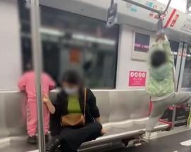 ▲10月5日,浙江杭州。2小女孩脚踩地铁座椅并用扶手荡秋千,家长在旁未制止。拍摄者杨女士称,自己上车时她们就在了,坐在中间的是孩子的妈妈,爸爸坐在对面。当时心情已经很不好了,就觉得应该克制一下这种行为。