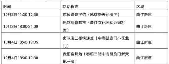 10月4日3:50-21:30 眉县首善街办经典庄园小区核酸采样点、眉县首善街办三道巷吾道鲜五谷养生鱼粉店、二道巷饮食市场公共厕所、张家蜂蜜粽子摊、鲁氏炒货店。