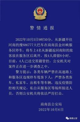 ▲10月6日,商洛市商南县公安局发布警情通报:2022年10月5日9时50分,从新疆开往河南的豫N86777大巴车在商洛市商南县金丝峡服务区停车,将车上4名从新疆返回南阳的旅客放在服务区后离开,致4人滞留8小时。目前,4人已送交原籍管控,公安机关对案件正在进一步调查之中。