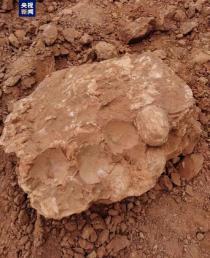 ▲10月5日下午,江西九江市武宁县罗坪镇关山村渡溪一工地挖出三枚疑似恐龙蛋化石,一枚化石露出大半,外壳有部分损破脱落,另两枚部分露出,保存完好,三枚蛋边还有数个印模,但现场未发现脱落的蛋化石。目前,三枚化石已交由武宁县博物馆收藏保存和进行进一步研究、考证。经多位化石专家研究,初步判断在江西武宁发现的恐龙蛋化石埋藏年代为晚白垩世,距今约7000万年。